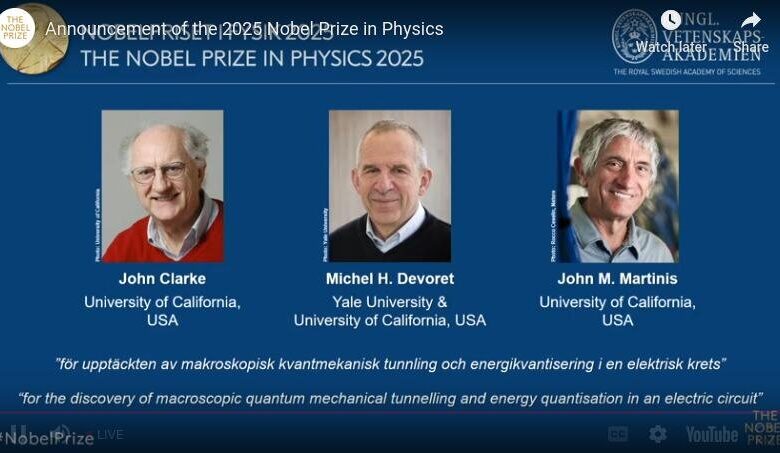 جان کلارک (John Clarke) از دانشگاه کالیفرنیا، برکلی، میشل اچ. دووره (Michel H. Devoret) از دانشگاه ییل، جان مارتینیز (John M. Martinis) از دانشگاه کالیفرنیا، سانتاباربارا برندگان جایزه نوبل فیزیک در سال ۲۰۲۵ هستند.